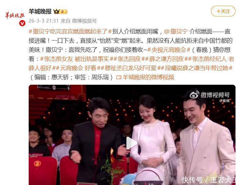 当别的央视主持人还在字正腔圆地念稿时,撒贝宁已经端着碗面在台上开吃了!3月3日晚间,2026年央视元宵晚会上,撒贝宁一段介绍宜宾燃面的沉浸式“吃播”,直接让全场笑点“燃”了起来,被观众封为“本届晚会最佳喜剧节目”。